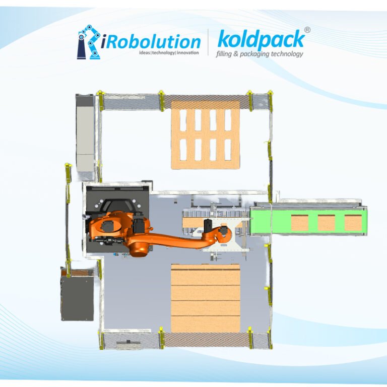 At iRobolution, we offer automated palletizing solutions: both robotic and conventional. Robotic palletizing systems are gaining popularity and becoming more cost-effective, while traditional palletizers, including bag, case, and gantry crane palletizers, remain widely used. We design and build the advanced robotic palletizing system (iR-iNovatRPa) that streamlines your end-of-line operations. The iR-iNovatRPa is a fully integrated, state-of-the-art solution that can handle multiple production lines. Engineered by top Robotic Palletizer Manufacturers in India, this product effortlessly handles a wide range of products, from 20L water jars and drums (up to 200kg) to CLDs, shrink-wrapped bottles, crates, and bags. Its innovative design allows for palletizing and organizing products according to your required matrix formation.